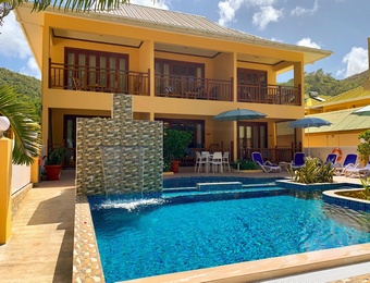 It stands 5 minutes off the Anse Reunion Beach; and is situated in a peaceful and exotic tropical garden of palm trees and a variety of flowering plants, providing a cool and breezy atmosphere complimenting the natural beauty of the island.
