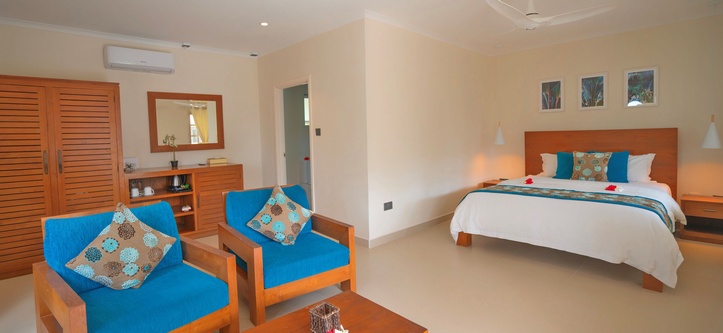 The 10 spacious mini suites (with 2 communicated rooms) very well decorated with sitting area and come with private terrace, air-condition, ventilators, mini-bar, TV, en suite bathroom with bath/shower, hair dryer, facility for tea and coffee. Most of the bedrooms can accommodate up to two adults and one or two children